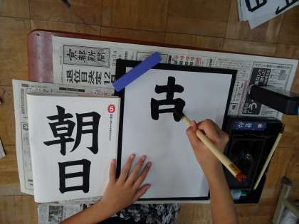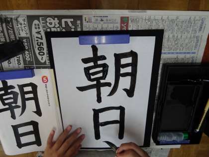 「朝日」を毛筆しました。左右や上下のバランスに注意して丁寧に書きました。