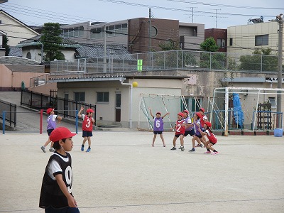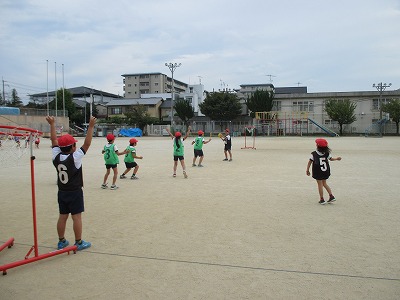開始してから5時間目となり,子供たちの動きも大きく,長いパスをつなげることも多くなりました。シュートの数を増やすための作戦を考えていました。