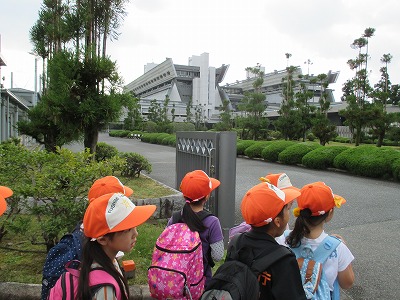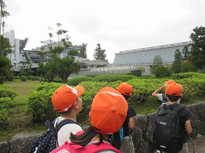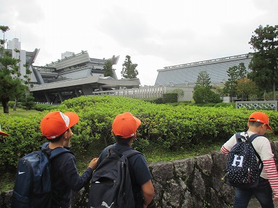電車を降りて,宝が池に行く途中,国際会館を見ました。子供たちは大きな建物であることに驚き,「船の形をしている」という発言もありました。京都でたくさんの国の人たちが会議をするときに使う場所であることを知りました。
