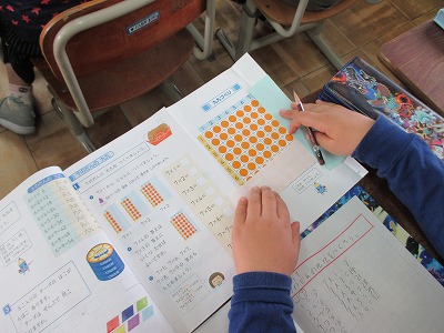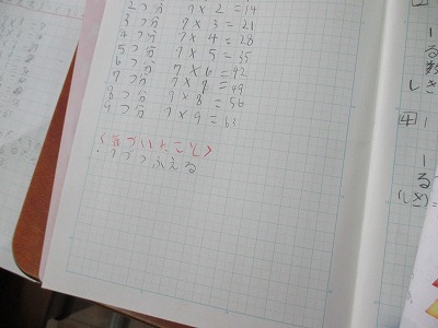 かけ算も難しい7の段に入りました。7の段の九九の表を見て気づいたことを話し合いました。7の段はさ行の音が多く発音しにくいところが多くありますが,唇と舌を素早く動かして発音していきます。
