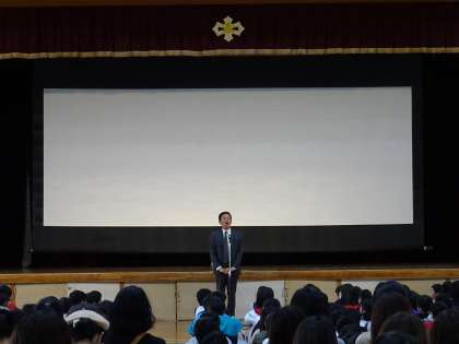 6年生は伏見中学校オープンスクールに参加しました。まずは,体育館で生徒会の先輩方のお話を聞きました。