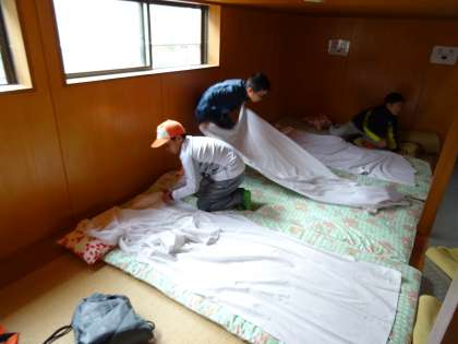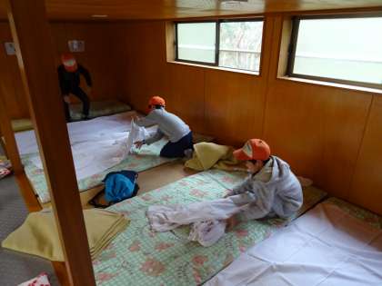 寝具準備です。初日のバンガローは男子です。