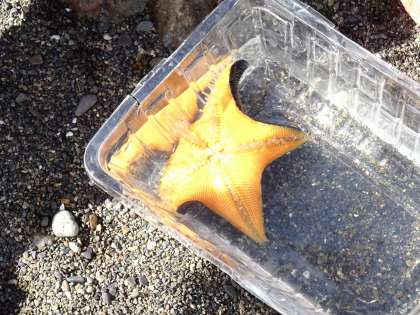裏返されたヒトデが元に戻る様子を観察しました。驚きの声が上がっていました。