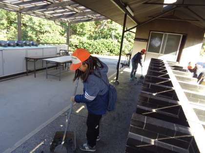 係やグループごとに分かれて,清掃活動をしました。野外炊事場の後片付けの様子です。