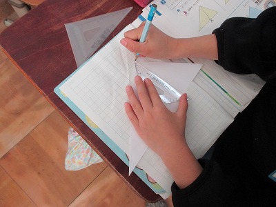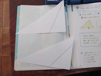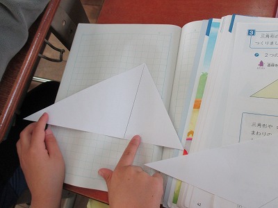 三角形の紙を2つに切って「2つの三角形」や「三角形と四角形」をつくりました。子供たちはどこに線をひけばよいかを考え分けていました。