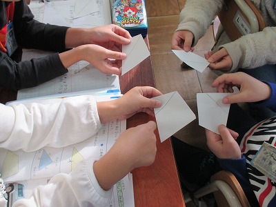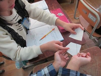 頂点・辺という言葉を学習しました。また,四角形を2つ三角形に分ける方法,2つの四角形に分ける方法,三角形と四角形に分ける方法を考えました。グルーや2人組で,分け方について説明して,共通点を見つけました。