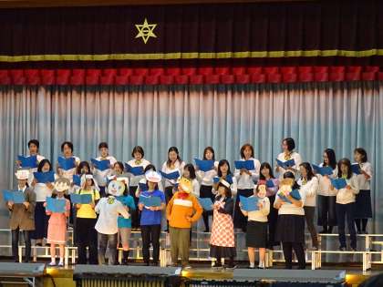 PTAコーラスです。伏見西支部コーラス交歓会での発表を全校児童に対して行いました。