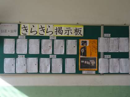 11月の道徳のテーマは「公正・公平」です。子どもたちの考えが掲示されています。