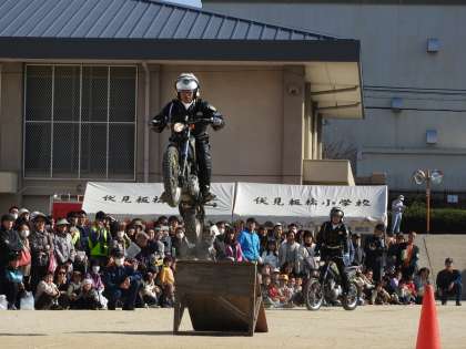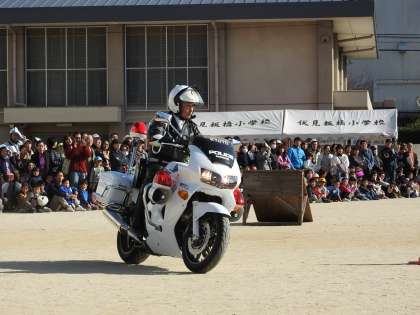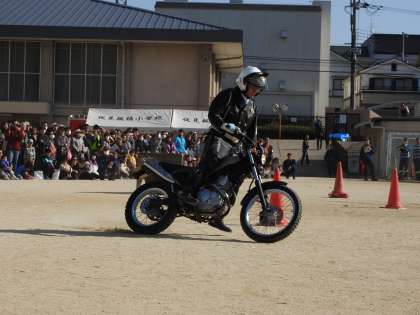 災害の時,白バイで現場を見に行く場合と,白バイでいけない場合は専用のバイクで出動されるデモンストレーションがありました。