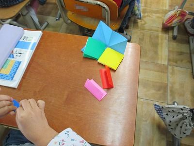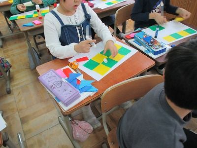 色紙で正方形・長方形・直角三角形を作り,敷詰めをしました。子どもたちは図工みたい。」と言いながら楽しそうに敷き詰めていました。