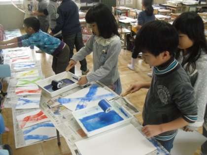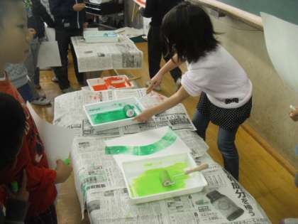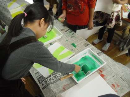 紙版画の作品作りをしています。今日は,ローラーを使って紙に色をつけました。