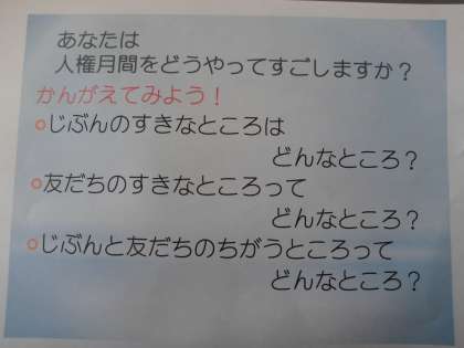 先日の朝会では,子ども達に人権月間が設定されている意味を説明し,自分たちがこの機会に考えてほしいことを伝えました。