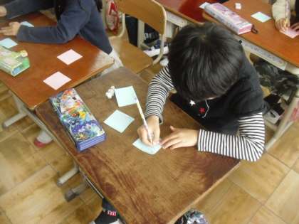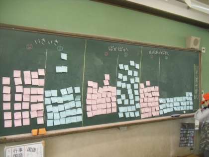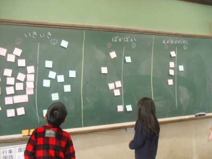 2年の学年・人権目標である『いきいき ぽかぽか えがおかがやく 2年生』をふりかえりました。できたこと・がんばったこと・うれしかったこと等をピンクの付箋に,少しできなかったこと・もう少しだったこと・3学期は頑張りたいこと等を青い色の付箋に書いて前の黒板にはりだしました。