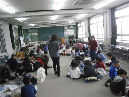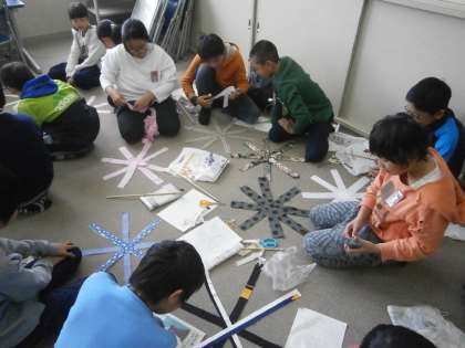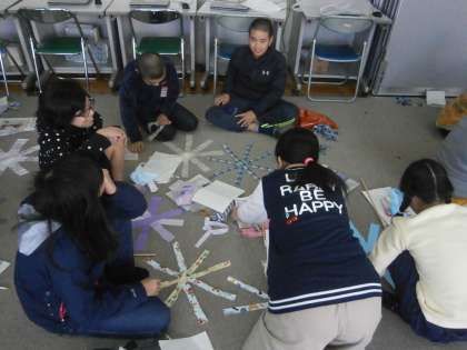 そこから用意した布のはぎれを用意し,放射線状に置いていきます。