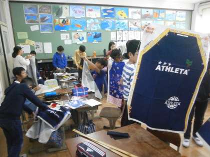 この日は届いたばかりのエプロンを広げて,完成図をえがきました。