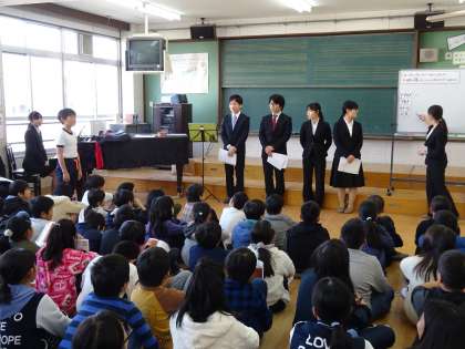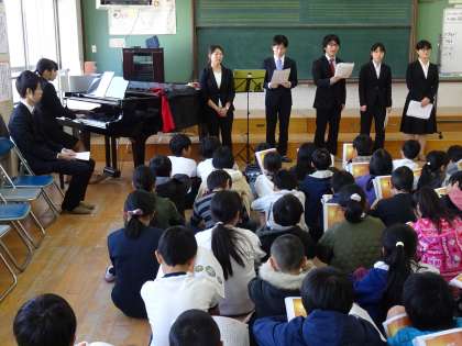 京都教育大学のみなさんをお招きし,音楽の出前授業をしてもらいました。ソプラノ・アルト・テノール・バスのそれぞれの歌唱を聞き,違いについて学習しました。