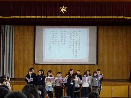 人権集会です。はじめの言葉に続き,全校合唱をしました。