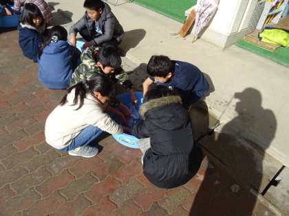 地域女性会の皆様に教わり,洗濯板を使って洗濯をしました。昔の人の苦労と工夫を知るよい機会になりました。