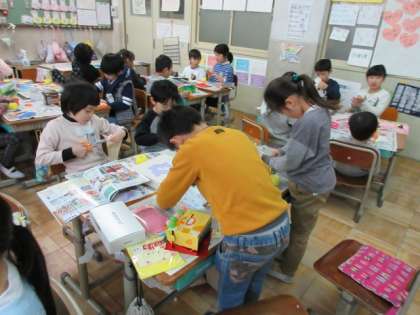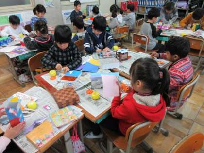 箱や紙袋に飾りをつけて,入れ物を作りました。