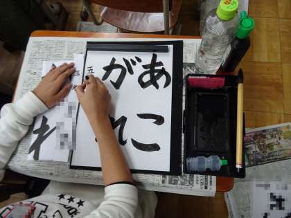 穂先の動きとつながりを理解し,用紙全体に対する文字の大きさに気を付けて,行の中心をそろえて字配りよく書きました。