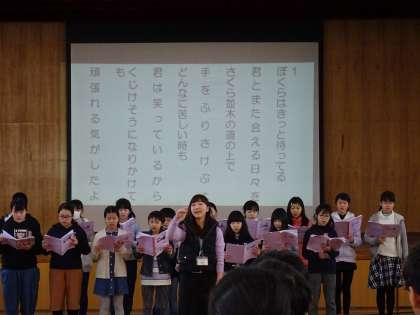音楽委員会の全校合唱です。今月の歌は「さくら」です。