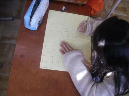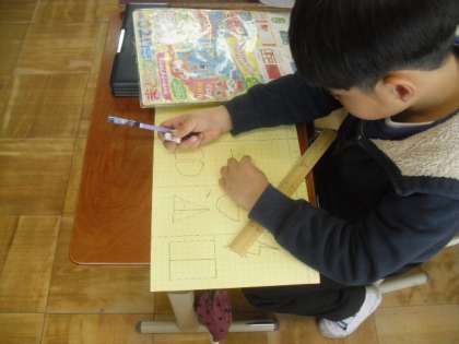 立体作品づくりをおこなっています。この授業では,方眼をつかい設計・下書きをしました。