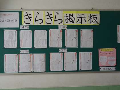2・3月の道徳のテーマは「親切・思いやり」です。子どもたちの考えが掲示されています。