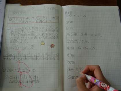 〇やΔを使って式に表し,表に書いて変わり方を調べました。