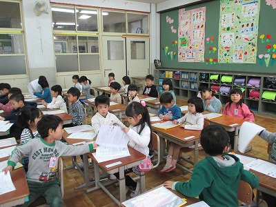 学校ではたくさんのプリントを家庭に持って帰ってもらっています。今日プリントを渡す練習をしました。前の人が「はい,どうぞ。」と言って渡し,もらった人は「ありがとう」と言ってもらっていました。