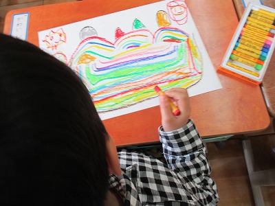パスを使って自分が考えた「おひさま」をかきました。四角いおひさま,おひさまの兄弟,自分が好きな色をつかってすてきなおひさまが出来上がりました。