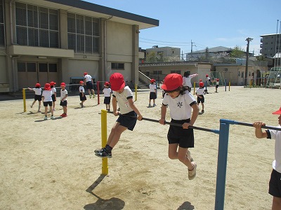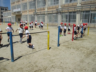 鉄棒のにぎり方,鉄棒に跳びあがり,足ふりをやってみました。