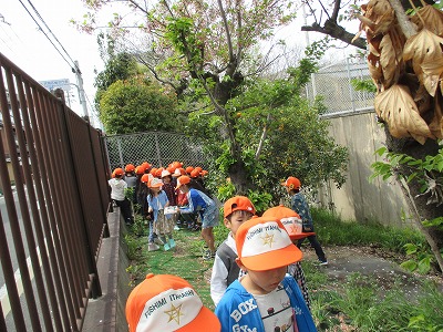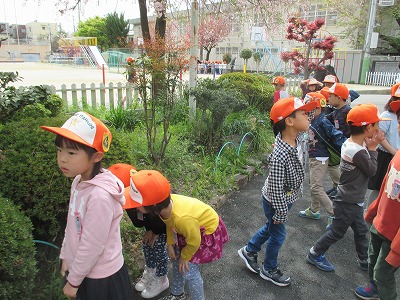 校庭に咲いている花や草,虫をさがしに行きました。子どもたちの興味はいろいろで,ハチの巣の抜け殻を食い入るように見ている人や,八重さくらを見た時,「さっくら?」とソメイヨシノとは違うことに気づいた人,たんぽぽを見て,茎の長さのちがいや花と綿毛に気づいて発言する子どもと,意欲的に春見つけをしていました。