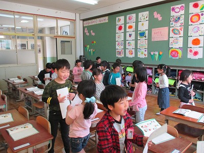 自分の名前を書いたカードをもち,自己紹介をしました。最後は知らない友だちを見つけて自己紹介をしました。