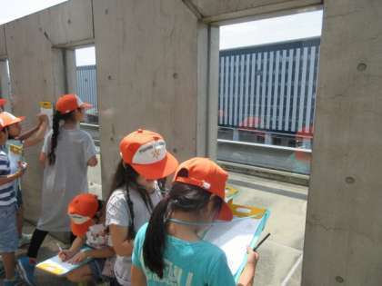 今日は社会見学に行ってきました。まず,京都駅のビルの上から町の様子を見ました。電車や人の動きを見ることができました。