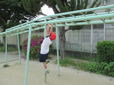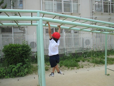 学校には雲梯(うんてい)があります。端から端まで行ける子どももいます。足を振ってリズムをとり,次のバーに進んでいました。