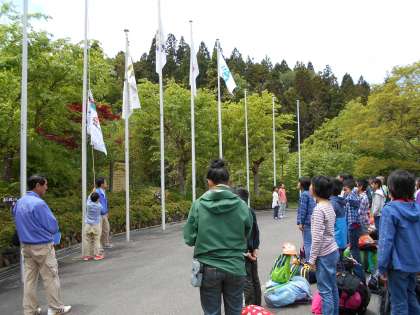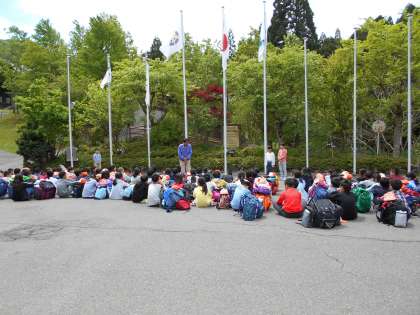 大変いいお天気の花背山の家です。本館前の広場で、入村式をしました。青空のもと、さわやかな空気の中で、のびのびと校歌を歌いました。初めの言葉もしっかりといえました。
