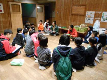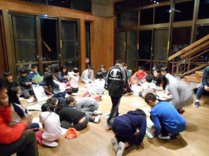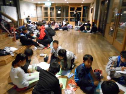 1日目の活動が終了し、まずは係ごとに反省会をしました。その後、班ごとに振返りをし、個々にしおりに思いを書きました。最後にリーダーが集合し、各班から出てきた意見を出し合い、担任とともに明日の活動に向けて意見交換をしました。きっと2日目はさらによい1日になるでしょう。
