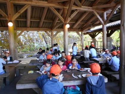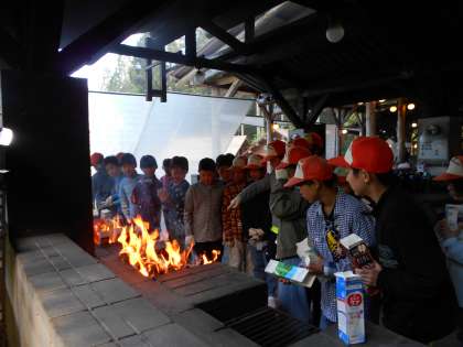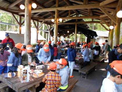 朝ご飯は、作ったホットドックをホイルで包んで牛乳パックに入れ、火で焼きました。アツアツのパックドッグを爽やかな新緑の中で、おいしそうにほおばっていました。