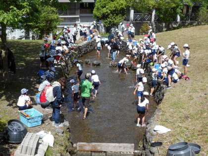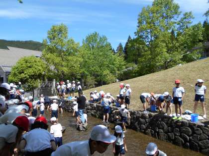 班で順番に池に入って、捕まえました。捕まえたら、次の人と交代です!