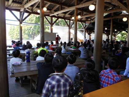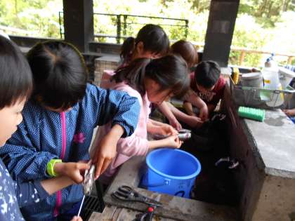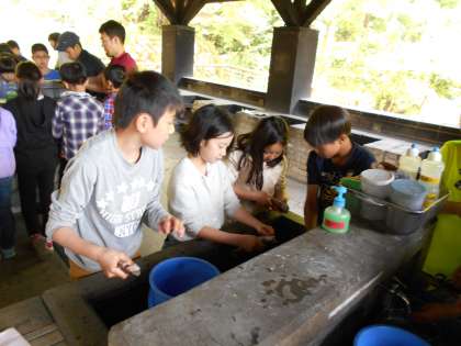 自分たちで捕まえた魚を調理します。花背山の家の先生に、魚の体の仕組みや、さばき方を教えていただきました。命をいただいているということをしっかりと考えるための活動でもあります。みんな、始めはおそるおそるでしたが、ひとり1匹さばいて焼くことができました。