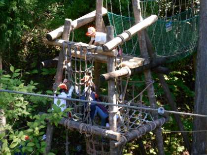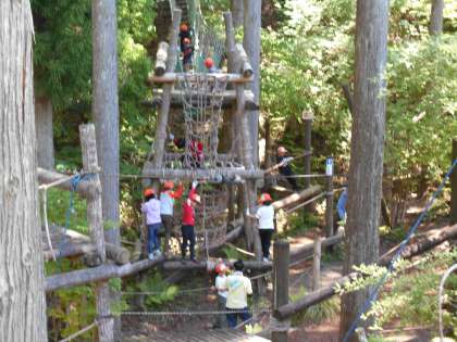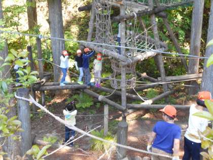 子どもたちが楽しみにしていたことの一つ、アスレチックです。スリル満点の冒険の森でした。
