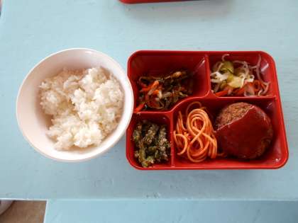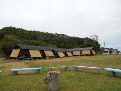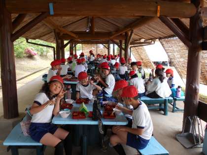野外炊事場は海が見えましたが、東屋は芝生と山の美しさが目に入ります。外での食事をみんな楽しんでいます。