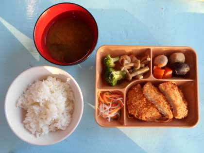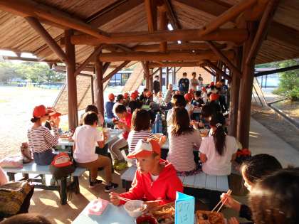 東屋での夕食は、昼間の活動のおかげで、みんなおなかがペコペコでした。夕食には、お味噌汁も付きました。