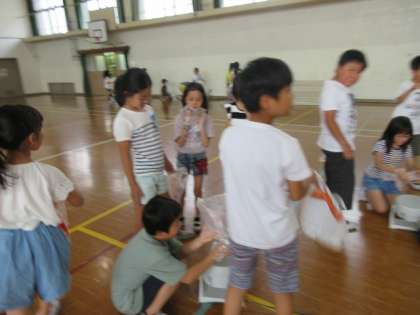 ビニール袋を使ってふんわりふわふわとぶものを作りました。早速出来上がったものを送風機を使ってとばしました。