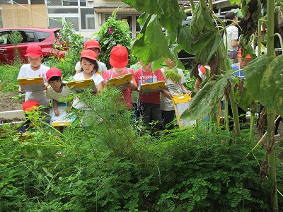 夏休みの間にとても大きくなりました。ひまわりの葉の大きさを自分の手と比べていいる子がいました。台風がきたこともあり,背が高くなったものは横に倒れてしまったことにも気づいたようです。雑草が多く生えていることにもびっくりしていました。