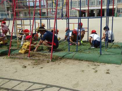 今日から 掃除時間を使って,草抜きを始めました。夏休みの間にたくさん生えた草をきれいにしようと頑張っています。今週は,低学年です。高学年のお兄さんおねえさんも少しお手伝いをしていただきました。