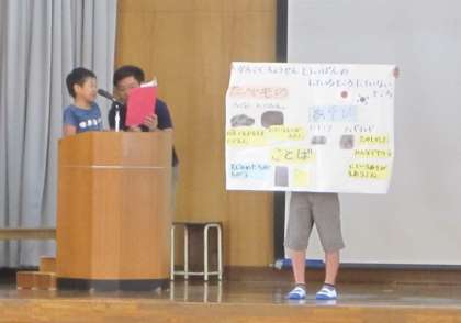 児童集会で,韓国・朝鮮の食べ物や遊び,生活について調べたものを発表しました。代表で発表した児童は,とても堂々とした素晴らしい発表でした。興味を持った遊びは,ひまわり学級でもやってみたいと思います。