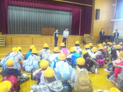雨のため、体育館で出発式をしました。みんなでいい思い出をつくろうという思いをもって、92名全員元気に出発しました。