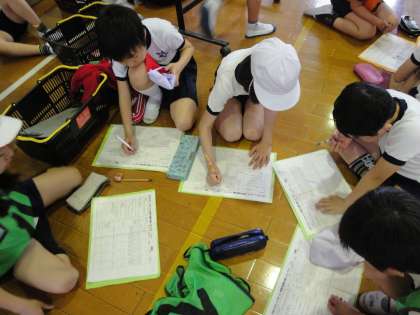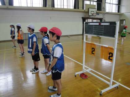 5年生は,体育で「バスケットボール」の学習をしています。チームごとに,準備と審判の仕事を一人一役で決め,出場メンバーを話し合い,他のチームと対戦しています。初めてバスケットボールの学習をするとは思えないほどの熱戦が続いています。