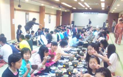 大広間でおまちかねの夕食をいただきました。豪華な料理に大喜びの子ども達。みんなで一緒に食べる料理は、格別おいしいようでした。